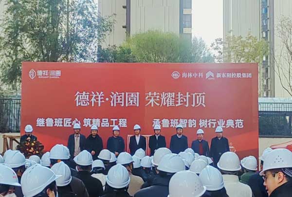 包广利在致辞中,向市委市政府给予的关怀、向各合作伙伴及一线建设者的支持和辛勤付出致以真诚的感谢和良好的祝福。他指出,德祥·润園项目是与浙江新东阳控股集团公司合作按商品房项目实施的,海林负责拍地,新东阳负责包建、包销售、包售后。项目定位为“准四代好房子”,设计中采取了一系列的有别于他家的新理念和新工艺,将为购房者切实提供更为舒适的生活体验。包广利要求,项目后期将以更高标准和更严要求组织实施,房屋将以“耳目一新”的体验感呈现给天水市民,明年9月底之前完成全部销售任务,年底按预期目标关闭项目。包广利最后宣布“德祥·润園项目正式封顶开始”。
