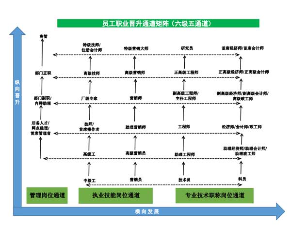 在员工职业发展通道上推行“六级五”通道。执业技能人才、专业技术人才可走专业发展通道,也可走管理岗位、营销序列与其他序列,为员工职业生涯发展提供广阔的发展空间。
